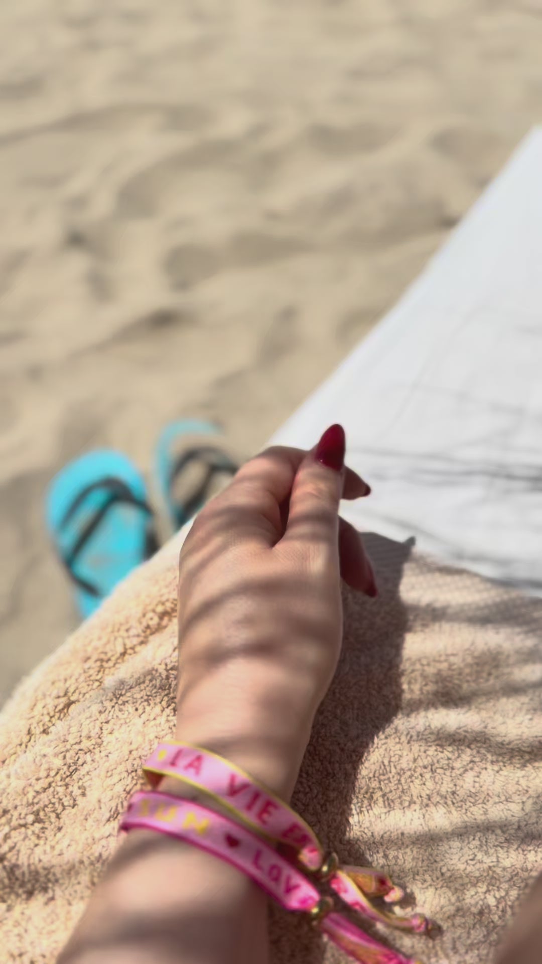 Der liebevolle Schriftzug LA VIE EST BELLE und das kleine Herzsymbol machen es zum perfekten Glücksbringer für dein Handgelenk. Der goldene Schiebeknoten sorgt für perfekten Sitz und einen Hauch von Eleganz.